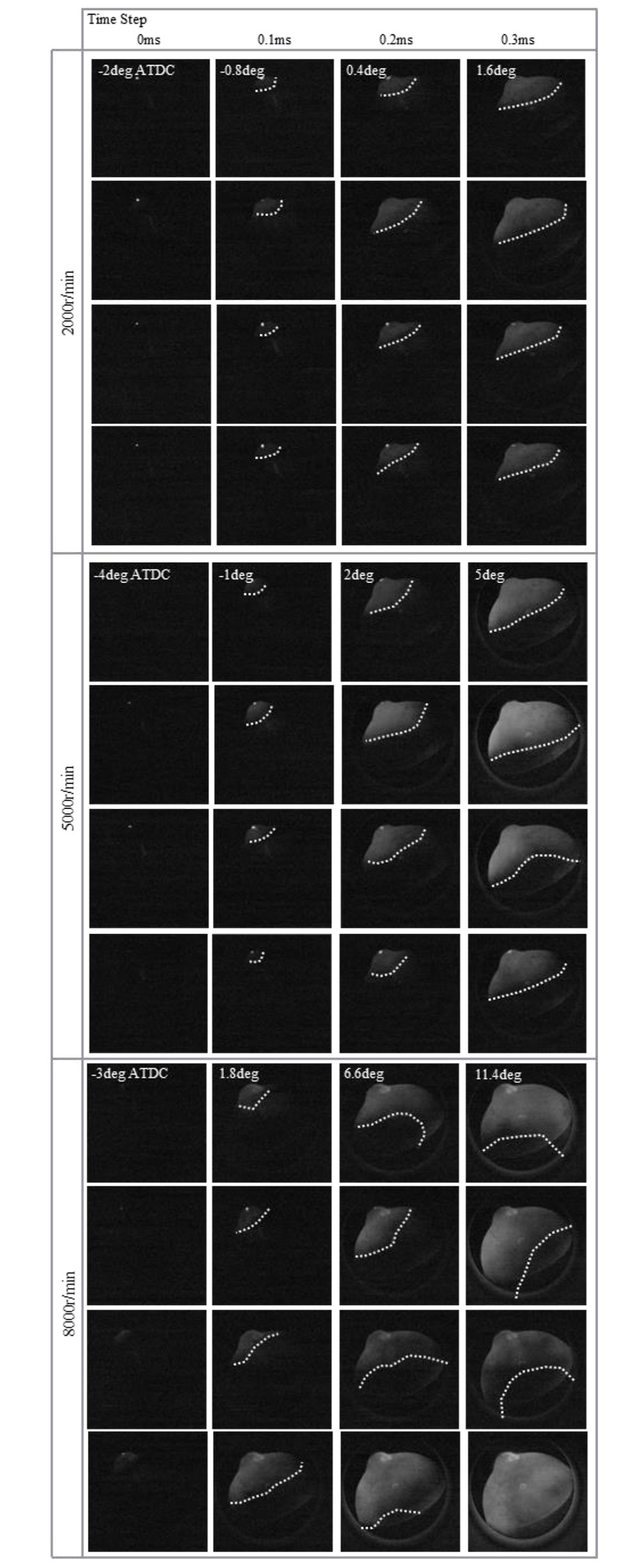 図3に、10000 rpmにおいて空気過剰率λ=2.0で運転した際の燃焼を、撮影速度20000 fpsで撮影した際の写真を示す。
