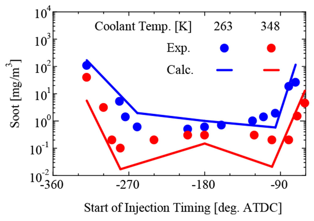 橋本ら(1)はガソリンエンジンの微粒子排出予測に向け、5成分ガソリンサロゲート燃料を用いた粒径分布予測モデルの開発と検証を行った。従来の3成分モデルを拡張し、イソペンタンおよびトリメチルベンゼンに対応した化学反応モデルを構築。実験結果との比較により、着火遅れ時間や層流燃焼速度、微粒子の質量・個数・粒径分布などを良好に再現することを確認した。さらに、燃料噴射時期や冷却水温(図1)、タンブル流強化の影響も再現可能であり、設計段階での微粒子挙動予測への有効性が示された。
