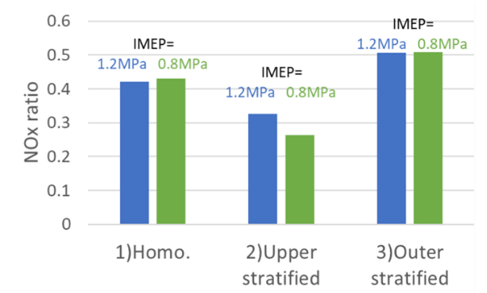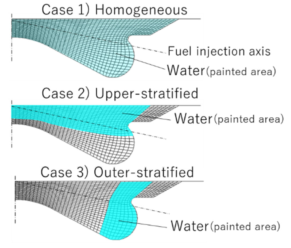 数値計算による成層化の影響として、水を均一に配置したケース1、燃焼室上方のみには位置したケース2、キャビティ外周部に配置したケース3の3条件で比較を行った(図1)。結果(図2)を見るとケース2ではケース1よりもNOxが低減し、ケース3では逆に増加した。これはケース2では多くの水が噴霧に巻き込まれて効果は上げたのに対し、ケース3ではそれがほとんど起きないためとしている。
