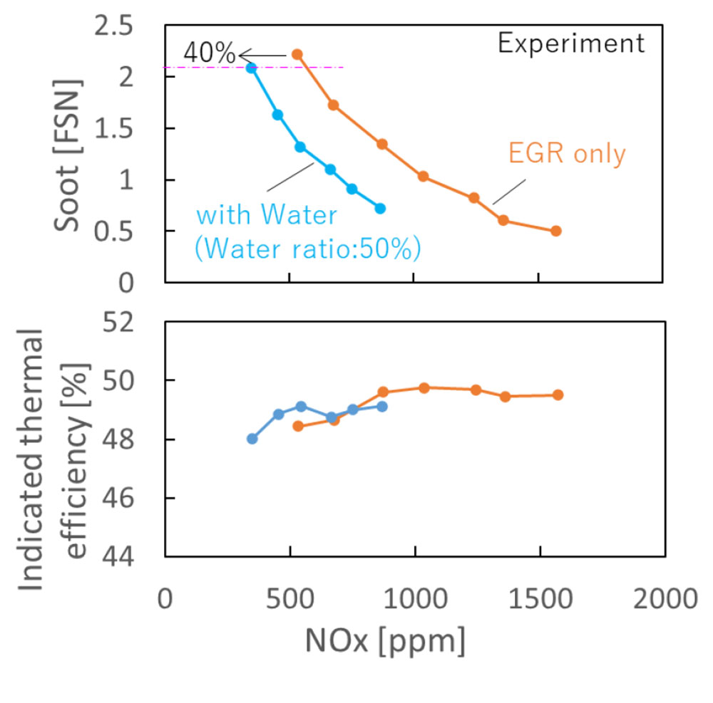 実機における効果の検証では、水のインジェクタはサイドに配置した(図3)。パフォーマンスとして、水を燃料の50%添加したときの燃費悪化はEGRと同等で、等soot条件ではEGRのみの場合と比較してNOxを40%低減できたという(図4)。