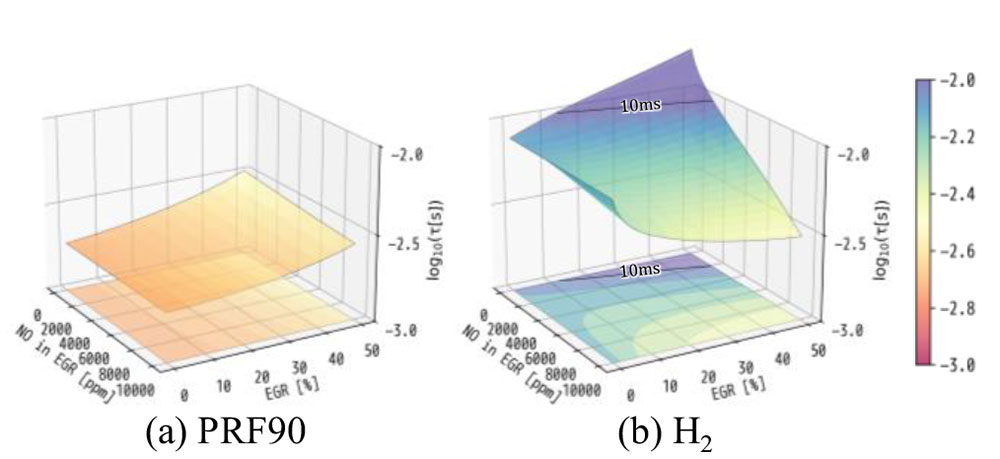 ① 水素燃焼では、ガソリン燃焼と比較してEGRガス中のNO濃度が着火遅れ時間に与える影響が大きいことが確認され(図1)、水素エンジン用のノックモデルにはNO濃度の考慮が必須である。