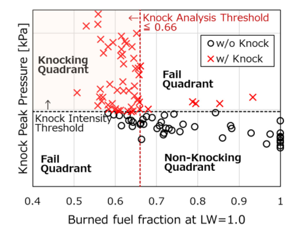 ② Livengood-Wu積分値が1.0に到達した着点における筒内燃焼率の閾値(≦0.66)によって、NO濃度を考慮したノッキング発生の有無を判別できることが示された(図2)。