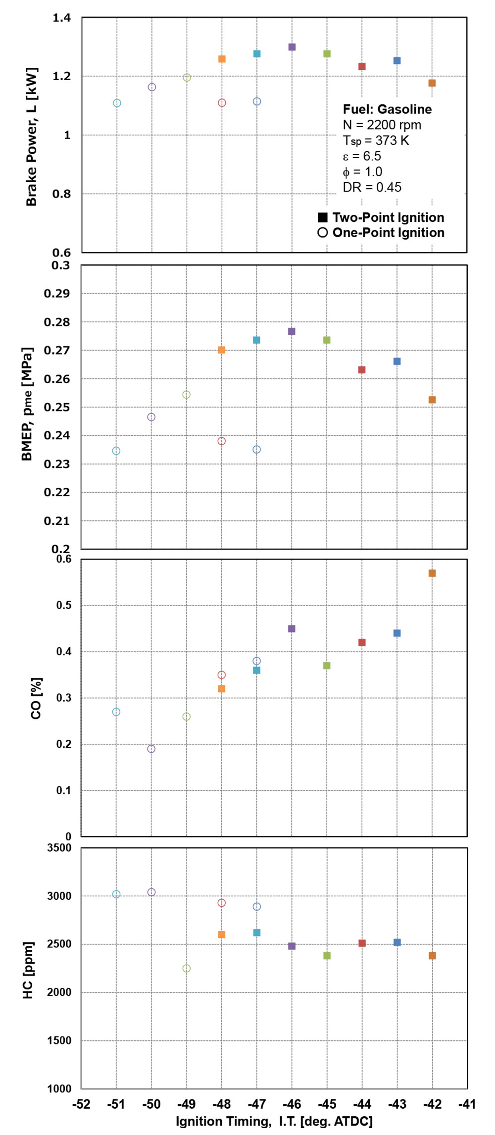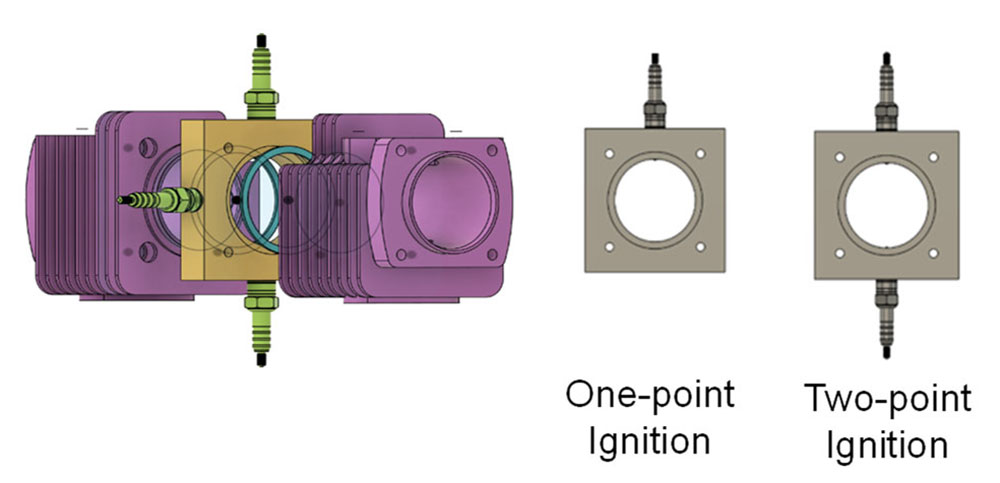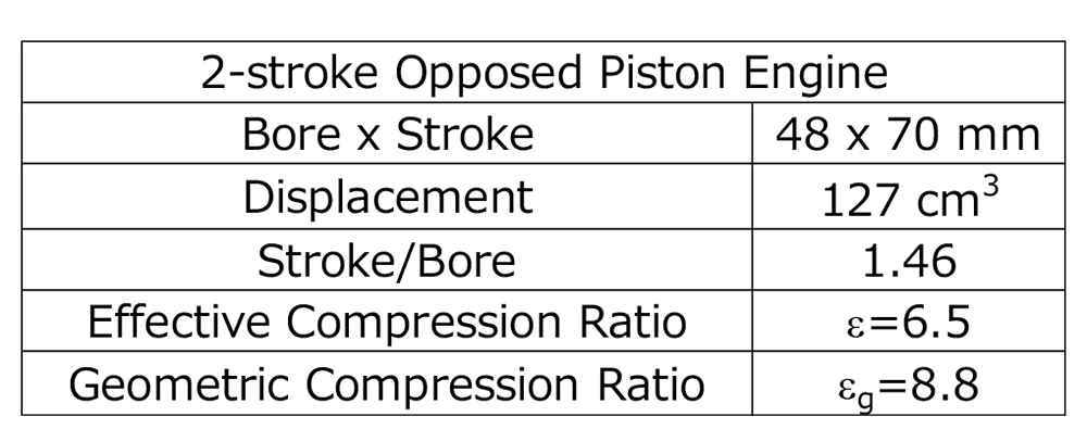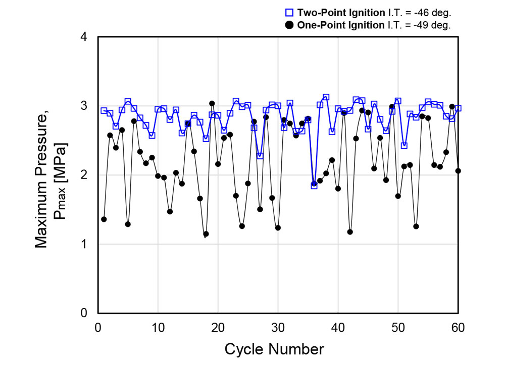 飯島ら(1)は電動パワートレイン用の内燃機関として、高出力密度、高熱効率、低振動を実現し得る、2ストローク対向ピストンエンジンに着目している。そして、その可能性を探るため、試作エンジン(表1)を作成し、吸排気形態は図1に示すように、一方向に作動ガスが流れるユニフロー掃気を行い。点火位置は図2に示すような、1点点火と2点点火を比較し、その燃焼への影響を評価している。実験結果を図3に示す。2点点火の方が高い軸出力L、正味平均有効圧力(BMEP)を得られている。また、図4に60サイクル分の筒内圧力最大値(Pmax)を示す。1点点火ではPmaxが低く変動も大きい。これは前のサイクルの残留ガスの影響だと考えている。2点点火条件では、Pmaxが高く安定した燃焼が行われており、残留ガスで希釈された条件下でも2点点火の有効性が示されているという。本研究はまだ始まったばかりとのことであり、今後の進展にてメカニズム解明や超希薄燃焼の実現、および熱効率向上や排気特性改善の取り組みに期待したい。