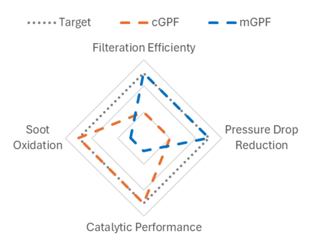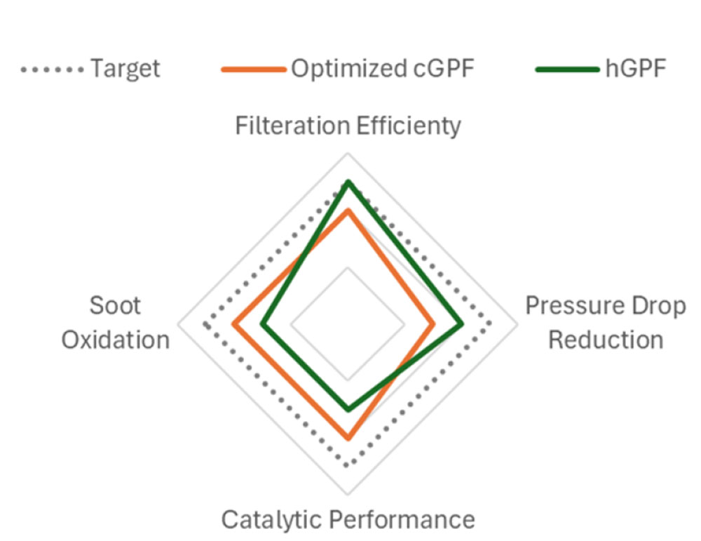 Sungmu Choiら(1)は、EU7やTier4などの将来PNおよびPM規制に適合するGPF(Gasoline Particulate Filter)に関し、設計パラメーターが性能に及ぼす影響を調査することでメカニズムを解明し、GPFの最適化手法を提案した。検討に用いた2種のGPFの特徴として、壁面塗布のGPF(以下cGPF)はPN濾過率が低くすす酸化が高く、メンブレンGPF(以下mGPF)はPN濾過効率が高くすす酸化が低い。圧力損失はcGPFの方が高い(図1、図2)。両触媒の長所を活かし、mGPFの出口チャネルへコーティングを施したハイブリッドGPF(以下hGPF)のコーティングの最適化も検討した。モデル構築と実機のベンチ試験により検討した結果、新たなモデリングとシミュレーション手法を開発し、現象のメカニズムを理解しながら最適化することで、商品の優先度とGPFの最適仕様を結び付けて、開発の効率化を図ることができた (図3)。