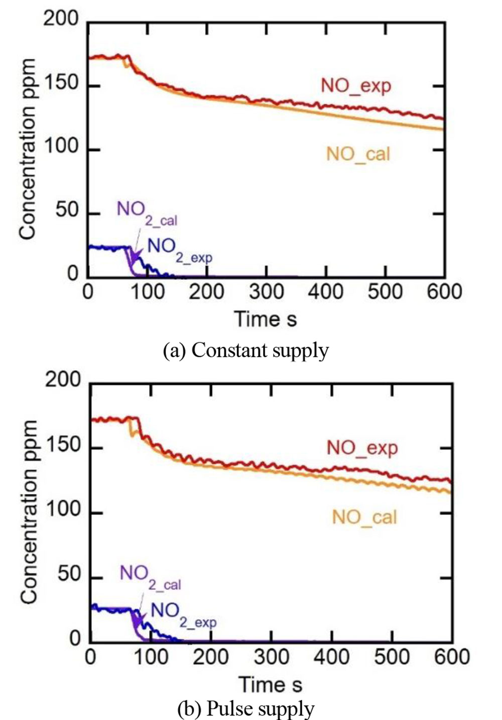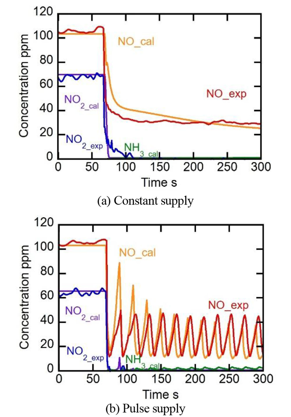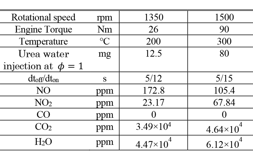 Yoshidaら(2)は、尿素SCR触媒の表面化学反応を実機エンジンの運転状態で解明するため、数値計算モデルの作成に取り組んでいる。本報告では、エンジン試験結果を元にモデルの表面化学反応速度パラメーターを変更しモデルの精度向上を検討した。尿素水噴射パターンを一定供給とパルス供給の2種類とすることで、定常だけでなく過渡での精度向上も試みた(図4)。エンジン試験により測定したガス種の濃度、入口ガス温度、尿素水量(表1)を数値モデルに用いて検討の結果、シミュレーション結果は実機結果の排出ガス挙動を良く再現できていた(図5、図6)。NO2の挙動に注目すると、ガス入口温度300℃のような高温条件では、高速SCRの浄化性能が完了し、標準SCR反応が起こりにくくなることも分かった(低温域でのSCR反応は、式1での高速SCR反応のR.1~R.4、標準SCRのR.5を示す)。