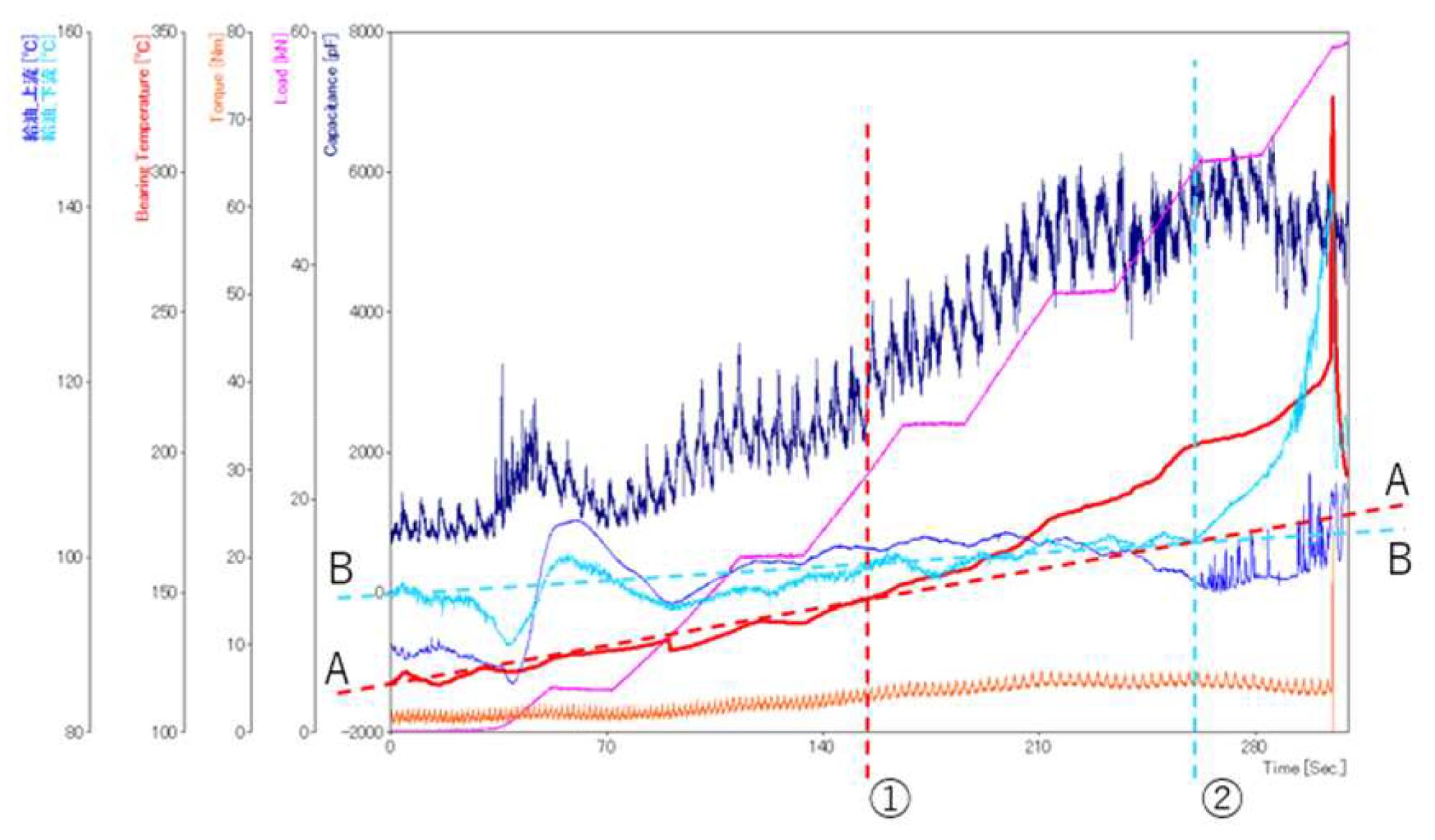 幸島ら(2)はエンジンの軸受が焼き付く直前に軸受入口の供給油温が上昇することを発見し、そこから軸受の焼き付きメカニズムを推測している。軸受の単体試験機を用い、軸と軸受を電極と見なした静電容量法による油膜厚さ測定、軸と軸受間の電気抵抗測定による金属接触有無の測定、オイル入口、摺動面下流、摺動部付近の油温および軸受温度の測定を行っている。図2および図3に測定結果を示す。黄色の線が軸の駆動トルクを示しており、右端の値の急上昇が焼き付きの発生を示している。グラフ上方の紺色の線は静電容量法により求めた軸と軸受のクリアランスを示しており、ピンクで示す負荷の上昇と共に値が増加しクリアランスが小さくなっている様子が示されている。しかし、焼き付きが発生する数秒前に値が減少し、軸と軸受間に存在する物質の静電容量に変化があった可能性が示されている。これと時期を同じくして油温や軸受温度の上昇が見られる。この時点で試験を停止した場合には、軸受表面に損傷が無かったことから、この温度上昇は焼き付きによるものではない。さらに同時に軸受へのオイル入口ではオイルの逆流が確認されている。これらのことから、摺動により発生する熱が冷却により奪われる熱より過剰となることで熱暴走がおき、オイルが沸騰することで焼き付きが発生しているとの仮説が示された。軸受の焼き付きメカニズムの解明は大きな課題であるが、本研究はそれに対し非常に重要な知見を与えるものと考えられる。