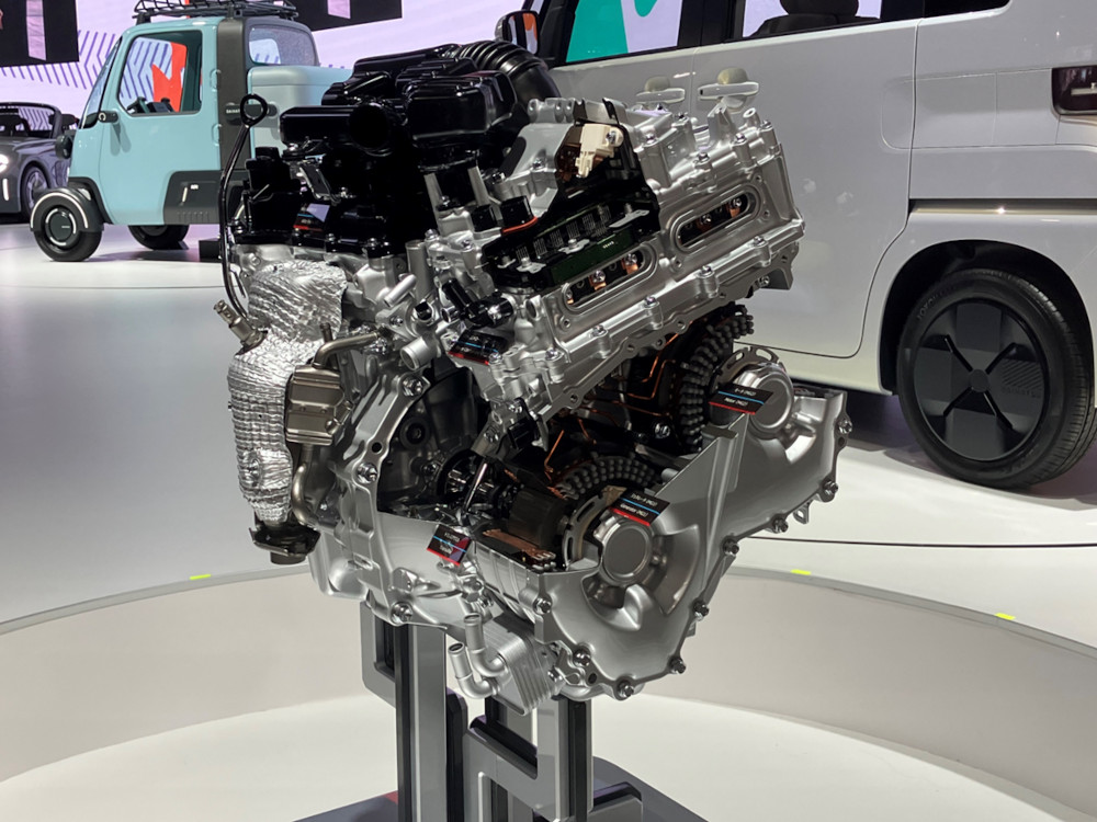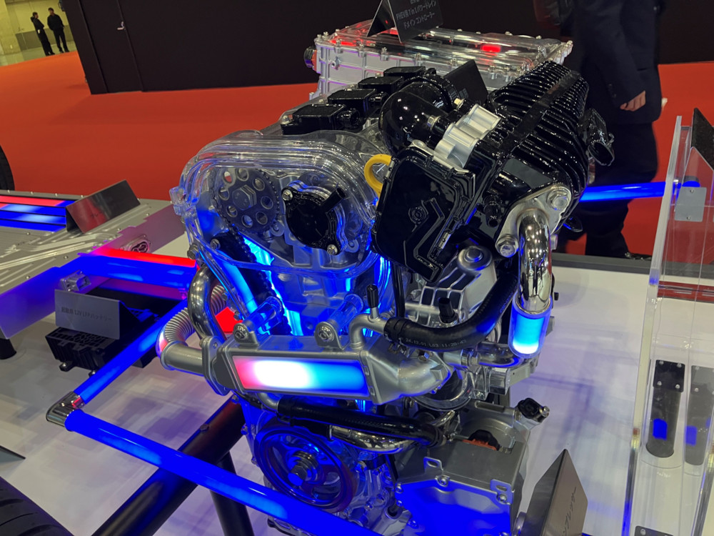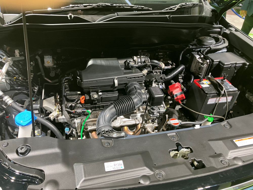 - KFエンジン(660cc)。軽自動車搭載用にコンパクト、価格にこだわったHEV。従来パワートレインと比較して約20%以上燃費向上。(野口)