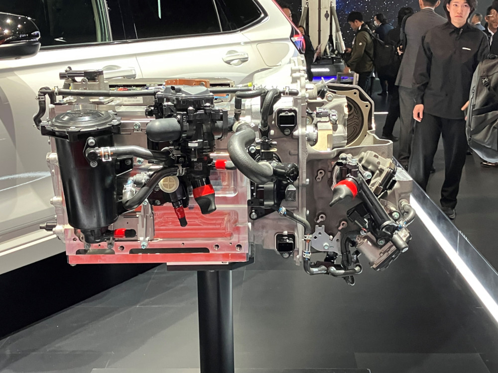 - 1.5LエンジンのPHEVシステム全体が見やすくモデル展示されている。エンジンはアトキンソン、補器駆動用ベルトレス、2系統冷却等で燃費向上を図ったとの事。(野口)