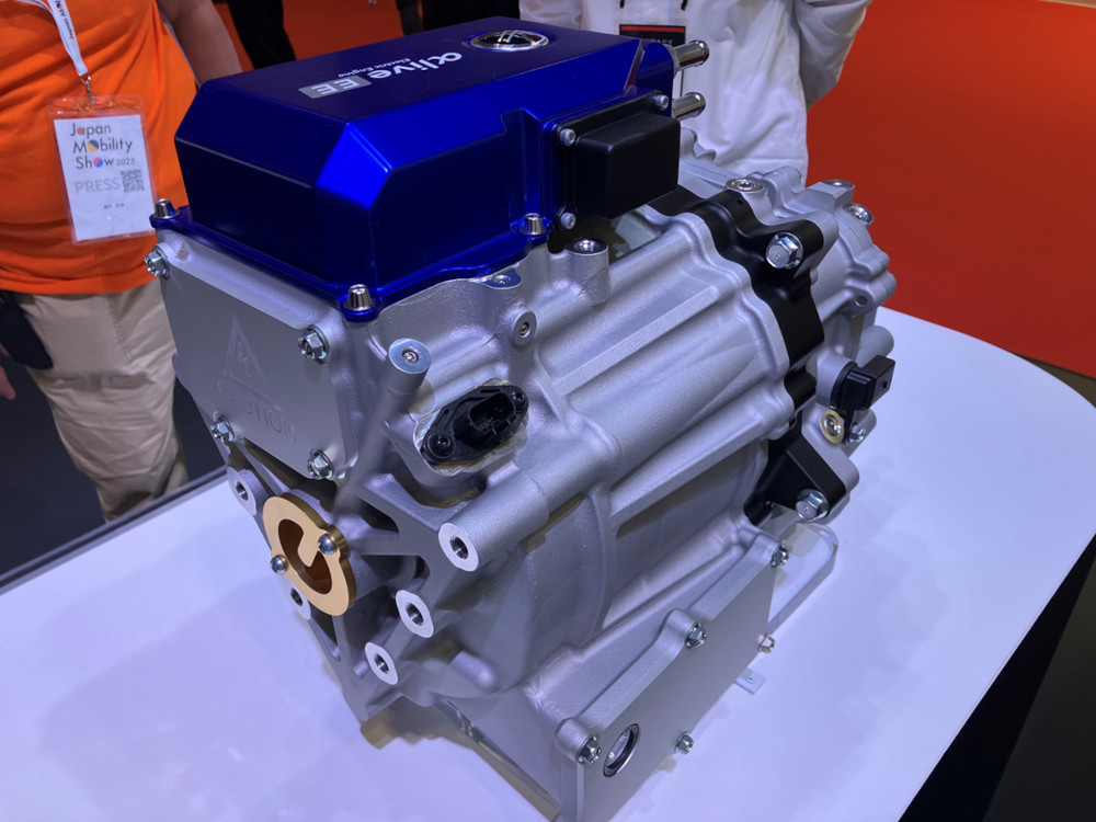 - 自動車メーカーへの供給を目的に開発中の自動車用電動駆動ユニット。モーター・インバーター・ギヤボックスの3 in 1構造。(野口)