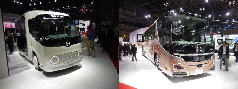 - 日野の耐久性を鍛えてきた象徴であるパリダカールラリー参戦車と市販車の日野レンジャーを見比べるのも面白い展示である。新しくなったFCV車もあり。(吉冨)