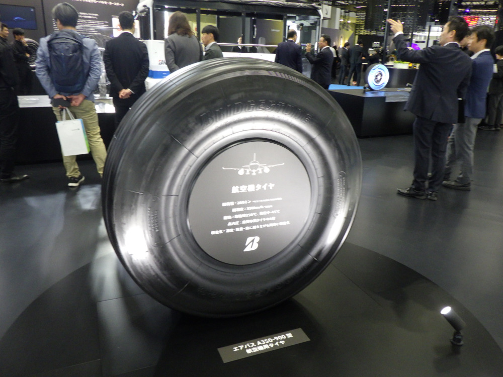 - 異彩を放っていたのは、旅客機エアバスA350用タイヤ。-45℃(飛行中)から250℃(着陸時最大)レベルの広い範囲で性能維持が必要。滑走路を走るタクシングが結構摩耗につながる。サステナブル性を高めるため、リトレッドを含めた製造から廃棄の低炭素化や軽量化がポイントという。(鈴木)