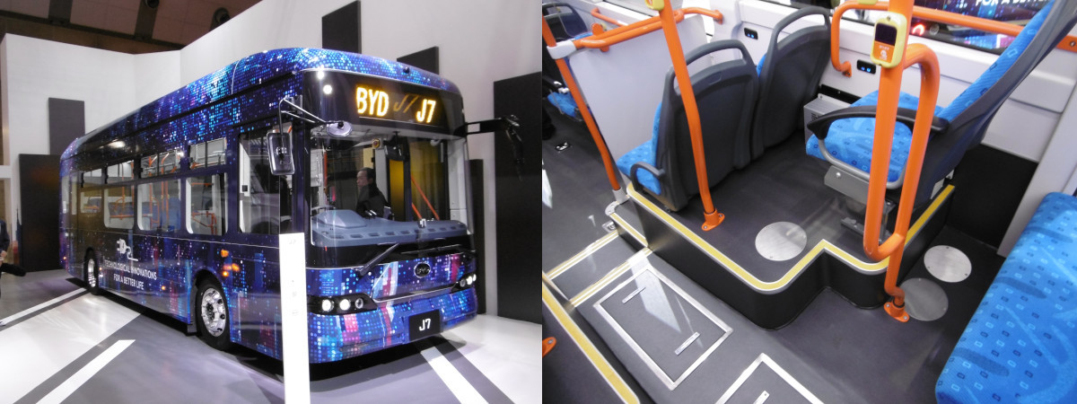 - 日本固有ともいうべき全長9m、幅2.3mの中型EVバス。(写真・左)日本市場向けというだけあって車内は国産車から大きな違和感はない。気になったのは、後部2列シートの中に1か所だけ1列のものがあったこと。そこは後輪上でホイールインモーター点検のためのアクセス口があった。(写真・右)(鈴木)