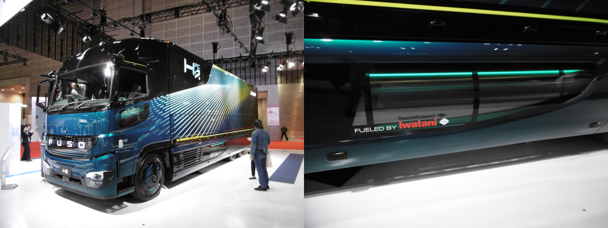 - いくつか展示されている水素燃料車で唯一液体水素を燃料としたもの。(写真・左)インフラも含めた液体水素供給系は岩谷産業が協業している。(写真・右)液体水素は加圧して供給(sLH2)することで再液化を可能とし、シンプルかつ無駄をなくしているという。また、70MPaの圧縮水素比で約1.5倍のエネルギー密度を得られたことで、他の水素燃料車ではキャブ後ろまで燃料タンクを搭載しているのに対し本車のみは荷台下にすべてタンクを収納してディーゼル車並みの航続性能を確保したという。(鈴木)