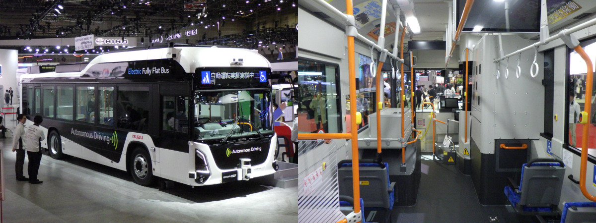 - すでに商品化したEVバス(写真・左)だが、近く神奈川県内で自動運転の実証走行をするという。前後左右に取り付けられたカメラやLiDARセンサーに注目。車内に巨大なユニットが設置されていたが、それが自動運転の制御を行うための機器とのこと。(写真・右)2028年にレベル4を目指すという。(鈴木)