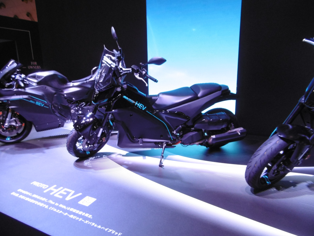 - スクーターなのでてっきりシンプルなものを予想したら、シリーズパラレル式で、単気筒エンジンとモーター、ジェネレーターを持つシステムを搭載。ジェネレーターも駆動に使うこともでき、3つのパワーソースがある。シリーズ式と比較すると、それぞれは小さくできるので、レイアウト自由度はむしろ高まり、重量バランスの重要な2輪車には適しているという。(鈴木)