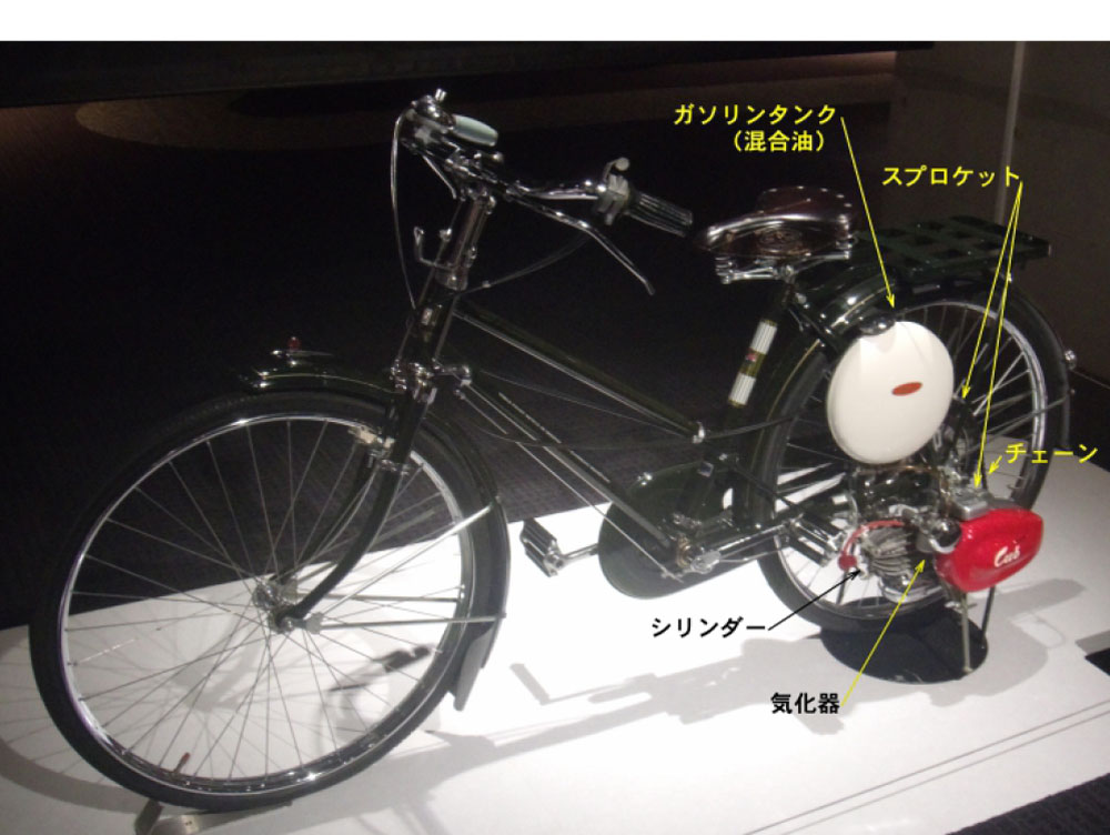 ひょっとしたら会えるかもしれない。そう思いながらHCH見学に参加した。昔の魚屋さんが使うような後輪のタイヤが太い自転車に、白い丸い燃料タンクと赤いエンジンがついた自転車オートバイ、カブ(図1)である。