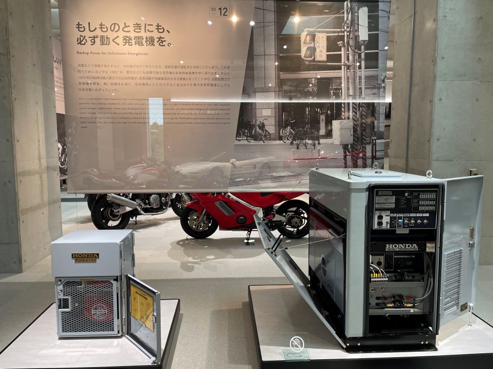 また、個人的に強く印象に残ったのは、災害用の信号機向け発電機(図10)の展示です。大きな災害が起きた際、停電で信号が止まり交通が混乱することがありますが、そうした事態を防ぐためのバックアップ用発電機がしっかりと用意されています。交差点で見かける無骨な箱の正体がこれであり、それをホンダが製造していたというのは、災害時の記憶と結びついて非常に印象深いものでした。