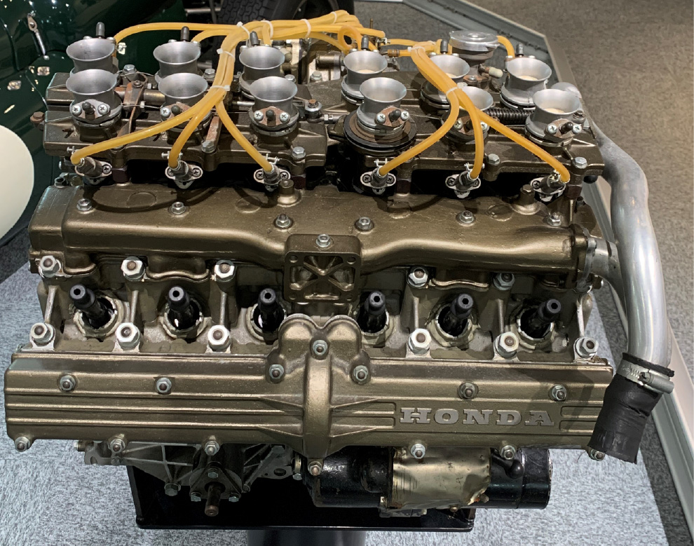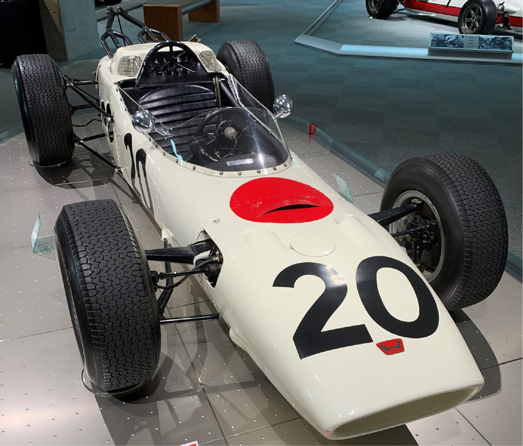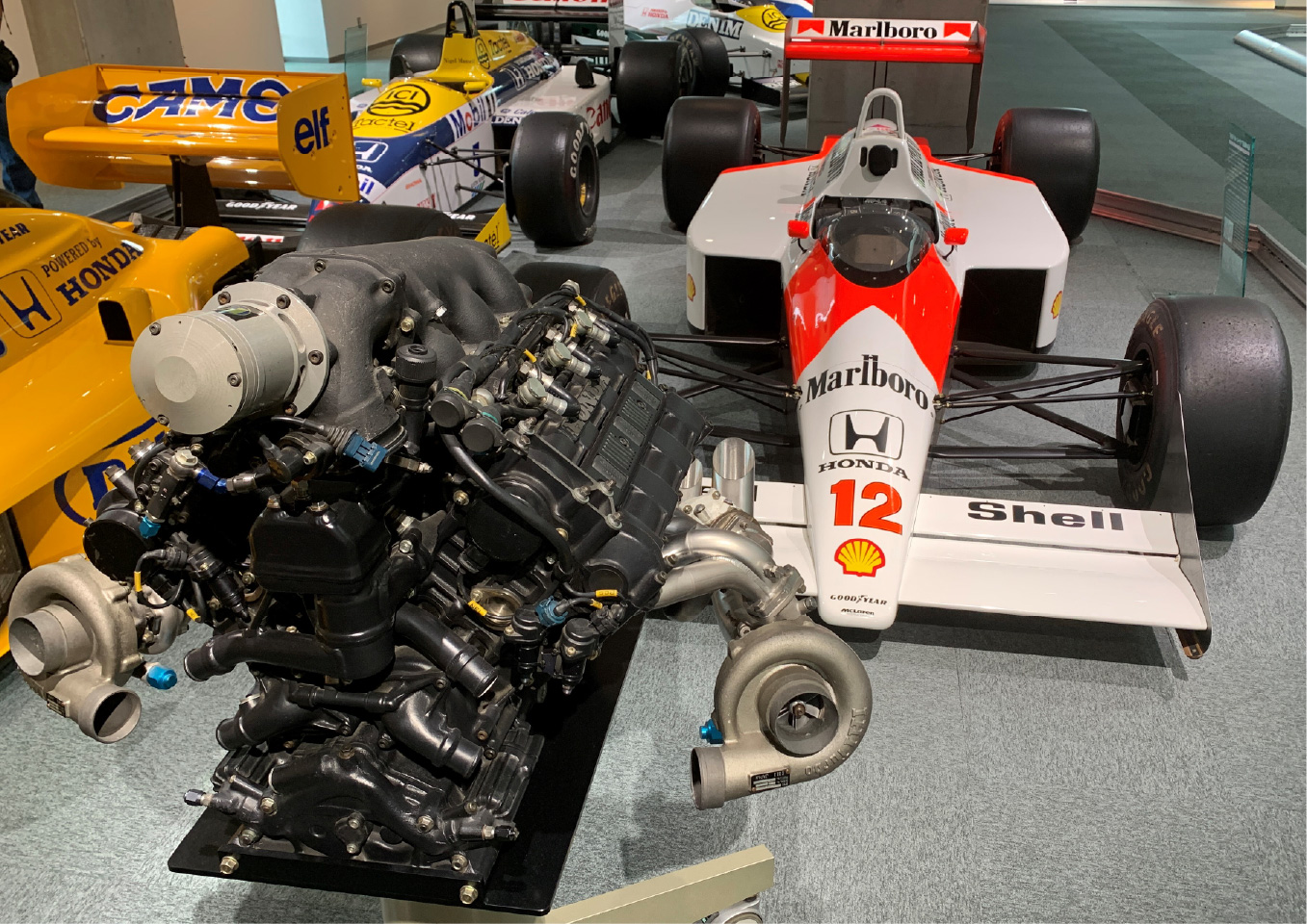 ホンダはまだ1台も自動車を生産したことが無い二輪車メーカーだった1961年当時、四輪レースの最高峰、F1への参戦を決断し挑戦が始まった。そして、四輪車に進出1年後の1964年F1世界選手権、第6戦ドイツGPに独自のホンダ製エンジン(図4)(RA271E_60度V型12気筒横置き1495cc最高出力220PS以上)とシャシーで日本初のF1マシン(図5)(最高速度300km/h以上)として参戦を果たした。その翌年1965年には、メキシコGPにて初優勝を成し遂げている。それから20年以上を経た1988年に年間16戦中15勝の最多勝利記録を樹立し、F1チャンピオンシップのタイトルを獲得した(図6)(RA168E_80度V型6気筒1494cc最高出力600PS以上)。図6がその年のベルギーGP、No.12アイルトン・セナの優勝マシンである。