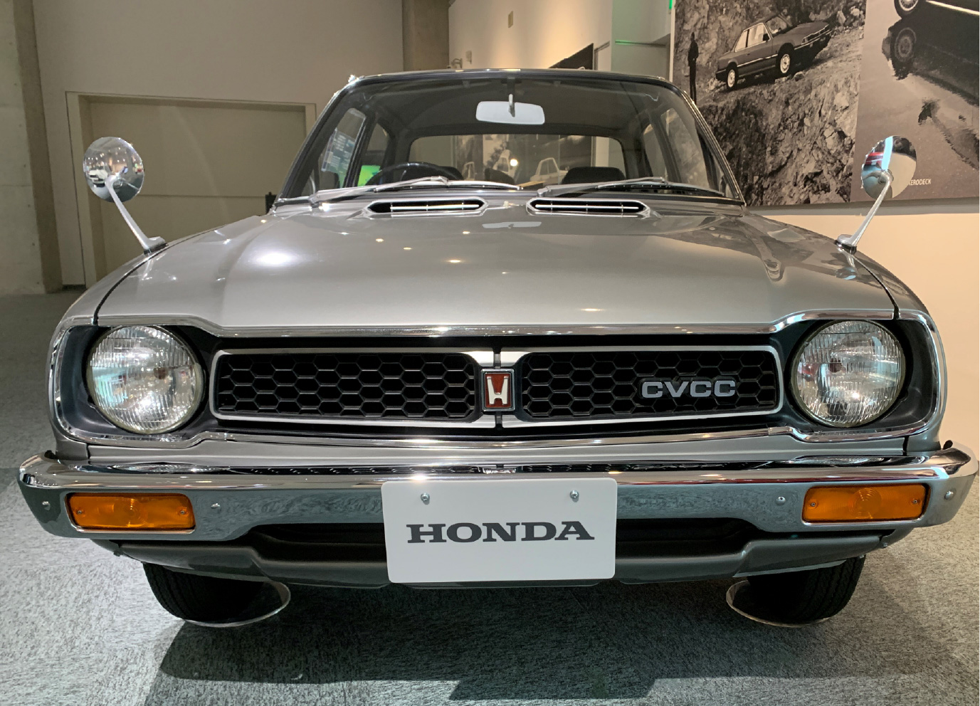 当時、達成不可能と言われていた、アメリカの自動車排出ガス規制である大気清浄法「マスキー法」を世界で初めてクリアするため、1972年に若手技術者が中心となり開発したCVCC(Compound Vortex Controlled Combustion複合過流調速燃焼方式)エンジン(図7)を発表した。“子供たちに青空を”という合言葉のもと、環境対策に取り組み、世界に先駆けて開発した低公害エンジンである。近年プレチャンバ点火として使われる副燃焼室であるが、この当時のガソリンエンジでは、使われていなかった副燃焼室方式による希薄燃焼を新技術として採用している。燃料供給には直噴ではなく、副燃焼室専用の気化器および吸気バルブが設けられている(図8)。また“自動車産業の社会的責任上なすべき義務である”ととらえ、このCVCC技術を他の自動車メーカーへ公開した。1973年には、マスキー法を世界で初めてクリアしたモデルとして、シビックCVCC(図9)を発表している。