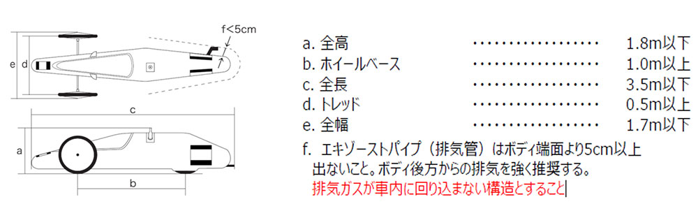 ■参加規則・競技規則・車両規則2025年全国大会は、10月11~12日モビリティリゾートもてぎのオーバルコースで開催される。グループカテゴリーは、全部で14クラスあり、CNグループⅠ(中学生クラス)はCN燃料を使用するクラスで、チームマネージャは教員の方とし、ドライバーを含むチーム員は同中学校に在籍している生徒としている。そしてエンジンはHonda製4ストローク50cc未満と規定されている。また別のクラスには、50cc以上150cc以下のエンジンを搭載したオリジナル車両で参加できるニューチャレンジクラス等もある。レースは規定周回数(距離)を決められた時間の中で走行し(平均速度25km/h以上)、燃料消費量から燃費を算出して、燃費性能の高さを競い合う。燃料供給は、大会事務局より大会公式燃料タンクの貸与があり、公式燃料が供給される。車体規定は、2人乗りクラスと二輪クラスを除いて、各クラス共通で図1としている。