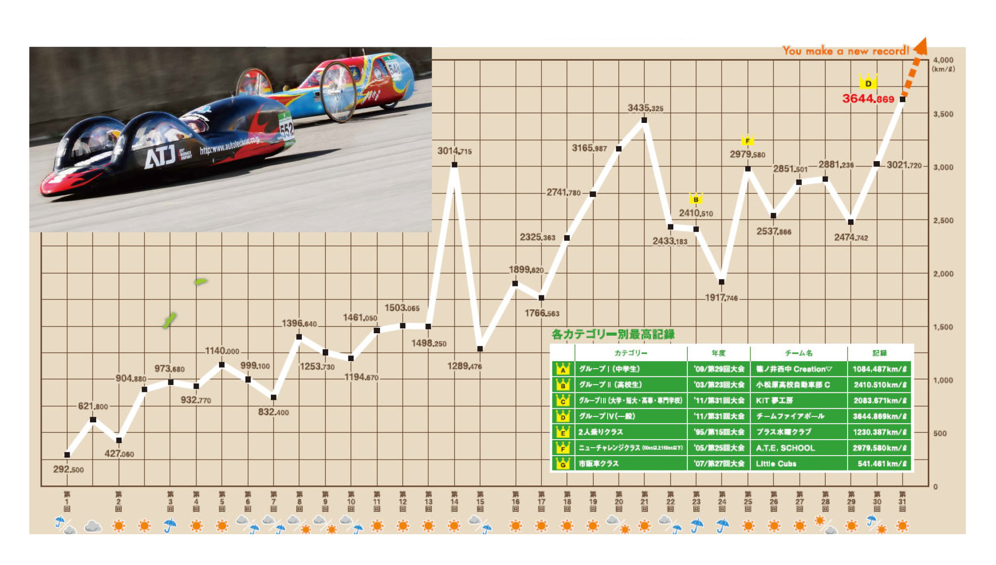 ■大会記録と将来への期待第1回大会は、1981年鈴鹿サーキットで開催された。参加チーム数は235チームで、記録は292.5km/lと最新の量産車と比較しても素晴らしい記録である。その後大会は回数を重ね、参加者のアイデアと技術向上は絶えることなく、図2に示すように、上下の凹凸はあるものの全体として記録は向上し右肩上がりとなっている。そして、現時点の大会最高記録は、2011年第31回大会で達成された3644.869km/Lという記録である。前述の合い言葉“君はガソリン1リットルで日本一周できるか?”の日本一周とは、本大会では46都道府県の主要都市を通るルートの総距離6000kmを指している。まだその目標到達への道のりは遠いかも知れない。しかし、本大会に参加する将来の技術者達の挑戦が、いずれこの目標を達成するであろう、そして日本の自動車技術を永続的に進化させることを期待している。