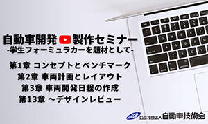 技術中核人材育成委員会では、学生を対象に、初めて自動車を設計・製作するにあたり、 何から手を付けたら良いかを手助けすることを目的に、 自動車の開発の企画から設計製造実験の一連の開発プロセスを理解してもらえるよう、 2007年に 『自動車開発・製作ガイド』(通称青本)を制作しました。 以下、その内容をオンラインにてご紹介できるようになりました。 次回の学生フォーミュラ大会に向けて、フォーミュラカーの製作に取り組もうと考えている方、 チームの中核として頑張ろうとしている方、あるコンポーネントの設計担当になったが 何から始めたらいいのか分からないという方は、参考にしてみてください。 オンライン講義をご覧になって興味を持たれた方は、是非『自動車開発・製作ガイド』をお求めください。