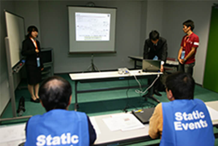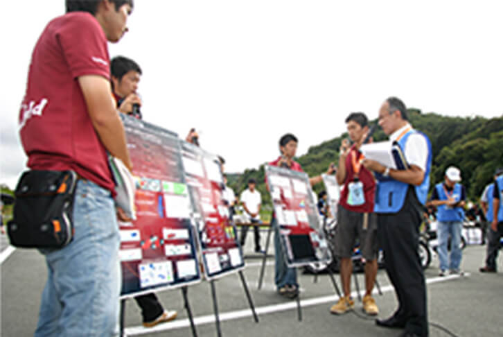 事前に提出した設計資料と車両をもとに、どのような技術を採用し、工夫をしているか、またその採用した技術が市場性のある妥当なものかを評価します。具体的には、車体および構成部品の設計の適切さ、革新性、加工性、補修性、組立性などについて口頭試問があります。
