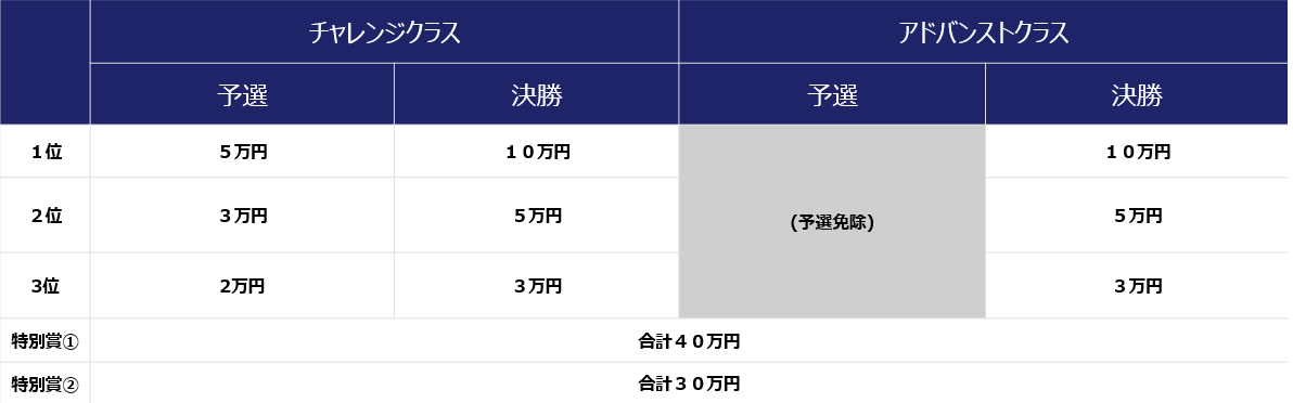 当該クラスに参加するチームは、予選が免除されます。また、決勝においてはチャレンジクラスとは別枠で採点・順位付けをいたします。