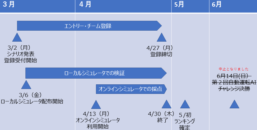 | 4/13(月) | オンラインシミュレータ用のアカウントを発行・通知 オンラインシミュレータの稼働を開始し、コードの受付を開始 (ランキングは随時更新) |