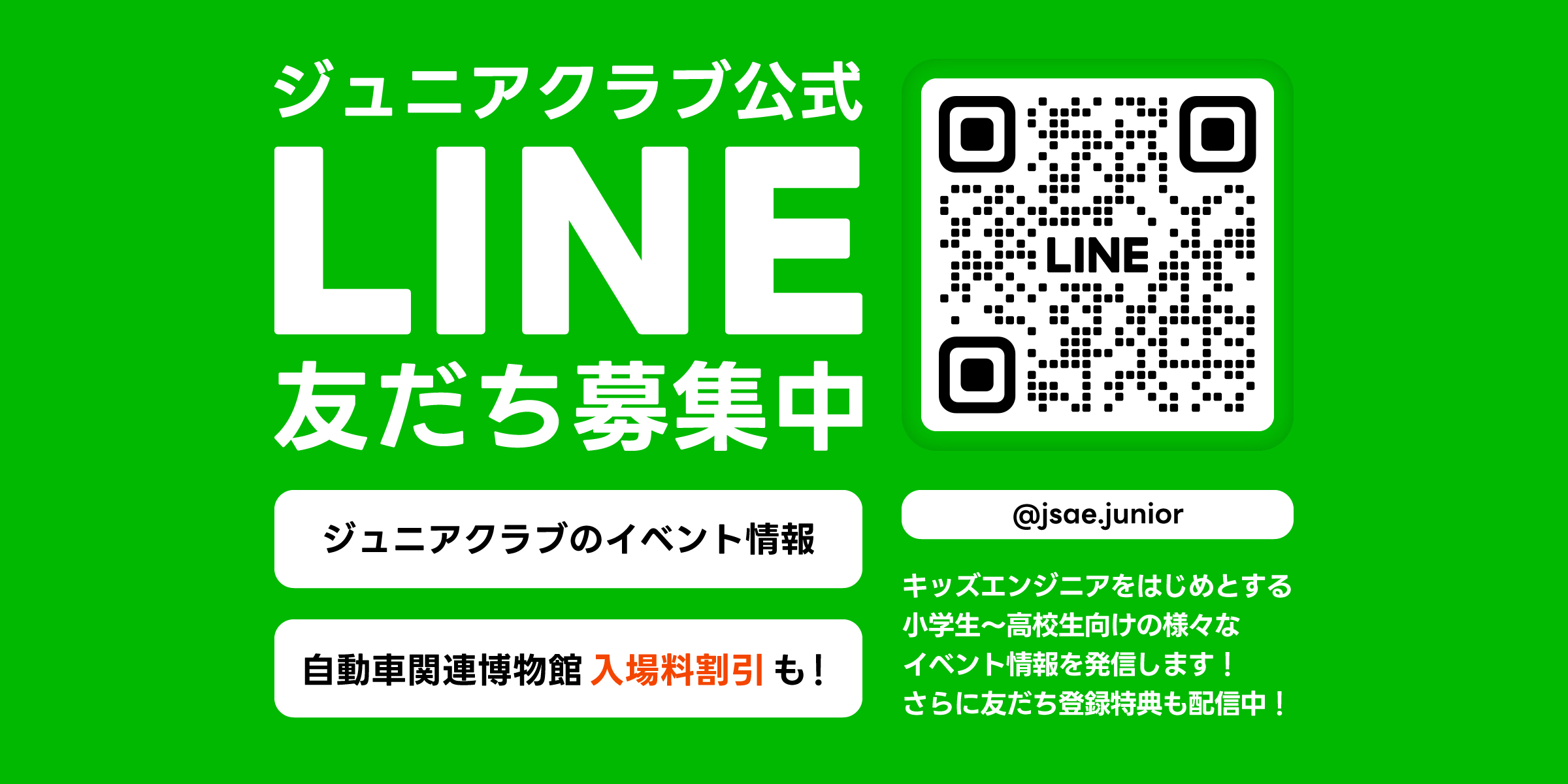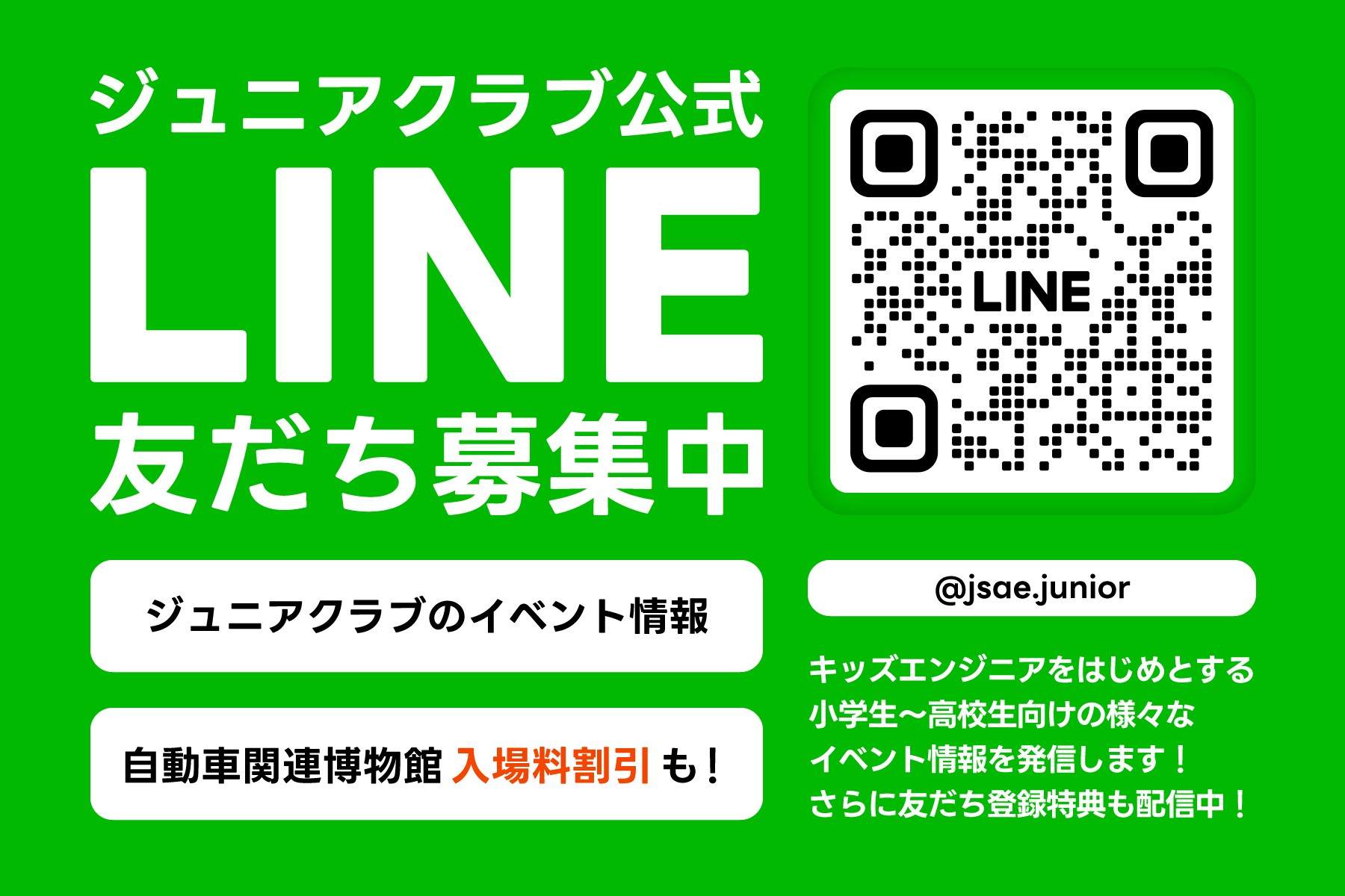 ジュニアクラブ公式LINE登録について 2025.06.17 LINE登録してくれたお友だちには「学生フォーミュラトレーディングカード」をプレゼント!!(8月1日・2日限定)キッズエンジニア2025会場で登録画面を見せてね! 一覧へ戻る 前のお知らせ 教室型プログラム事前申込の皆様へ(抽選結果をメールにて通知いたしました。) 次のお知らせ キッズエンジニア ソフトウェア・プログラムミング関連教室のご紹介