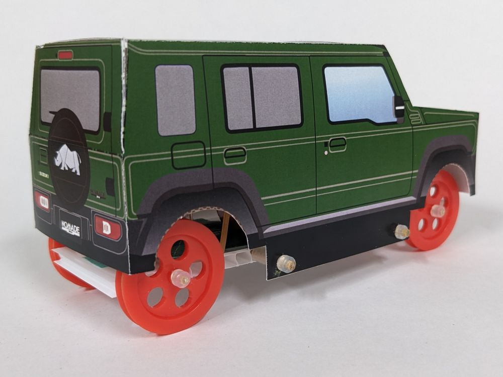 プーリー4つを車輪として車台に付けて、自作モーターの回転を輪ゴムで伝えれば、モーターカーが動きます。