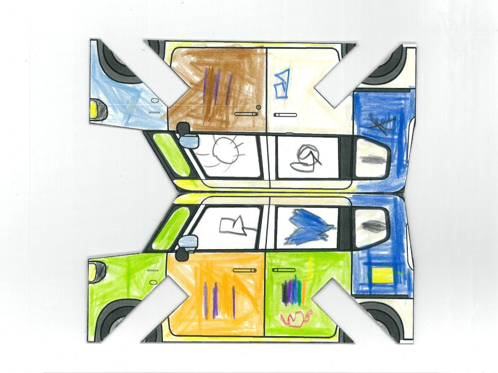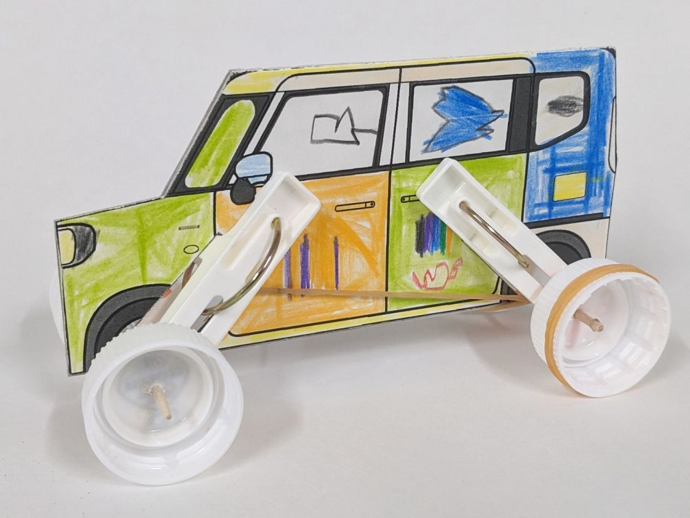 車のぬりえに色をつけてから、輪ゴム・洗濯ばさみ・ボトルキャップなどを付けてプルバックカーを作ります。