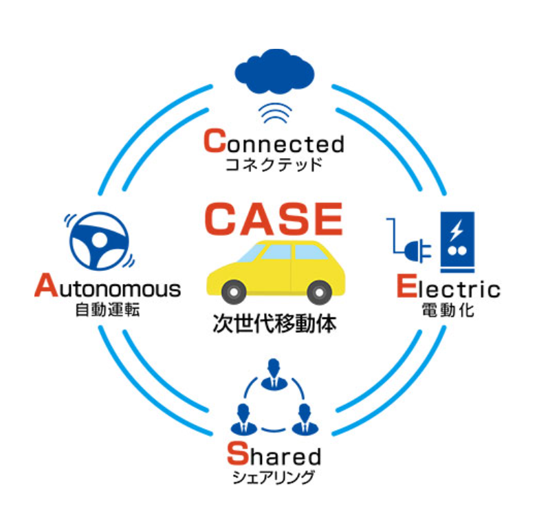 CASEとは、今後の自動車と関連産業に求められる「通信(C)、自動(自律)化(A)、サービス&シェア(S)、電動化(E)」を意味する。
