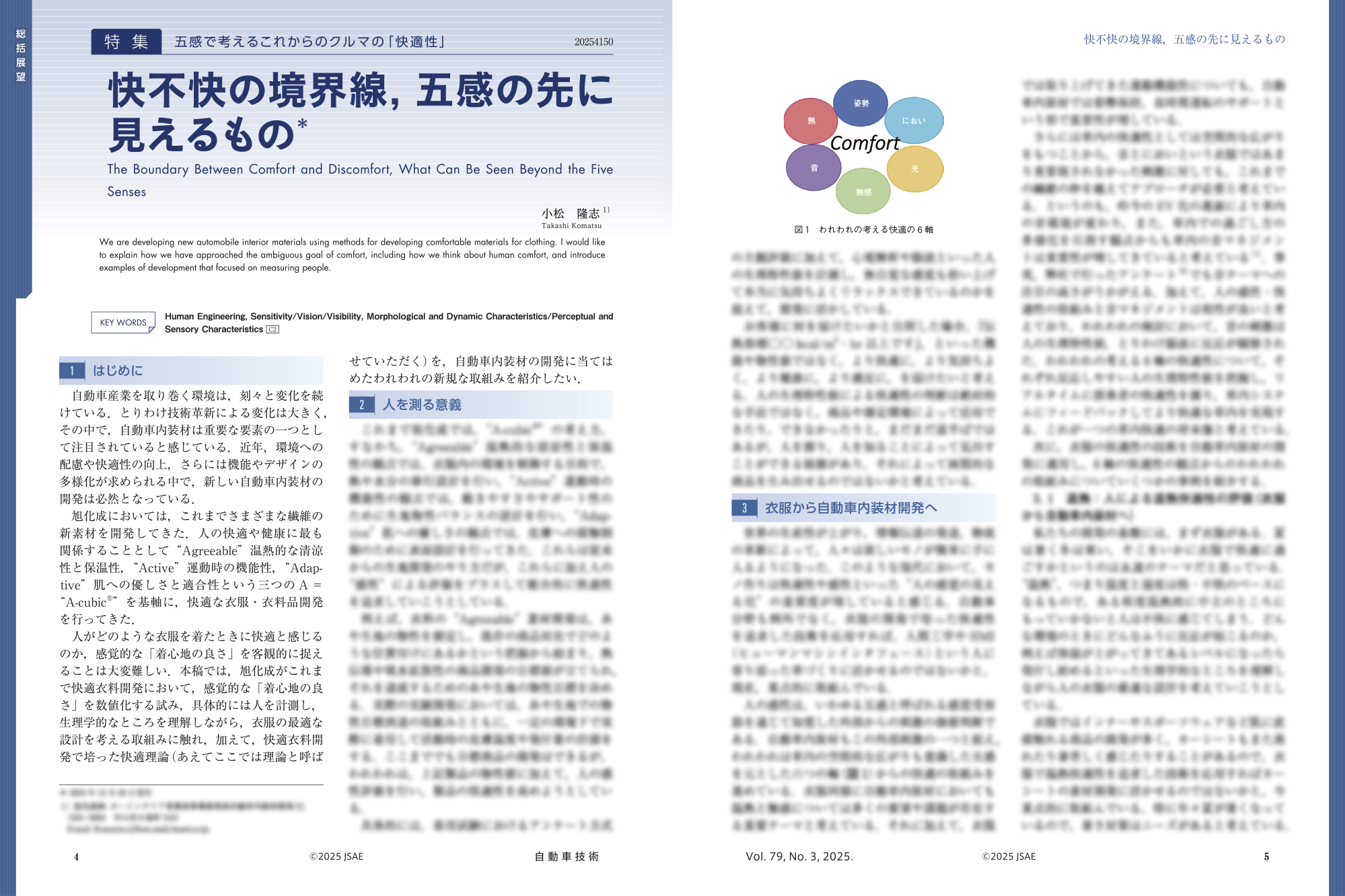 自動運転技術も電動化技術も、完成に向けて日々技術開発が進んでいます。その変化の中で、乗員の「快適性」も大きく変化していくと考えられます。本特集では、車の快適性を人間の五感で整理し、各章を構成しました。自動運転技術の進化、EV普及により変化する快適性への対応技術を、業界の取り組みとともに紹介しております。是非ご覧ください。