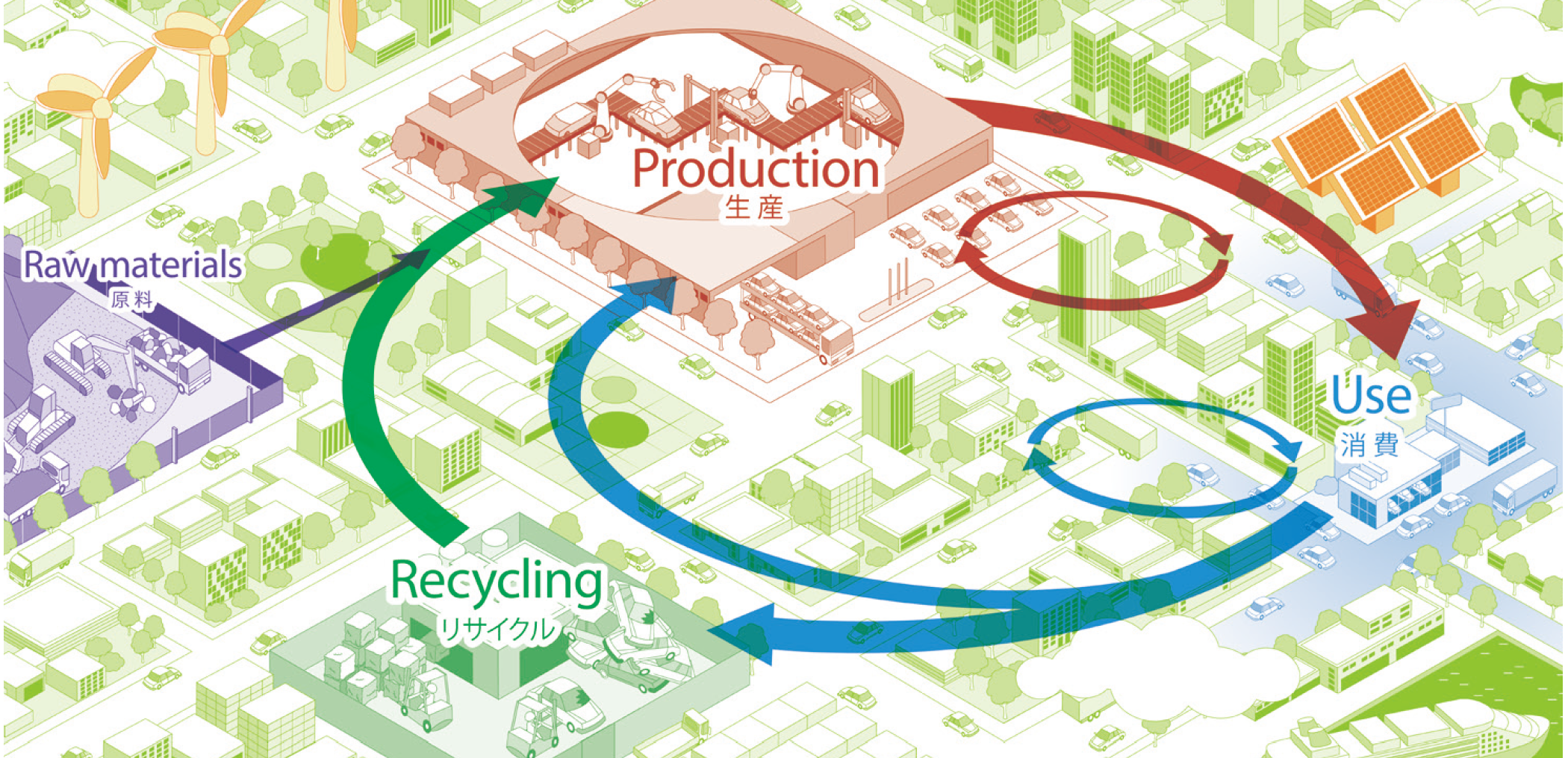 本展示会では、自動車産業バリューチェーン全体での循環型社会の実現に向け、新しい仲間との共創を紹介します。「循環」をキーワードに、自動車ライフサイクルにおけるGHG算出、カーボンフットプリント削減や資源の再利用に対して有効となるトレーサビリティ、使用済みの車両から資源を回収・分別する静脈産業の技術も展示しています。循環型社会の実現に向けて「知恵・技・匠」で皆さんと一緒に考える「場」の1つです。