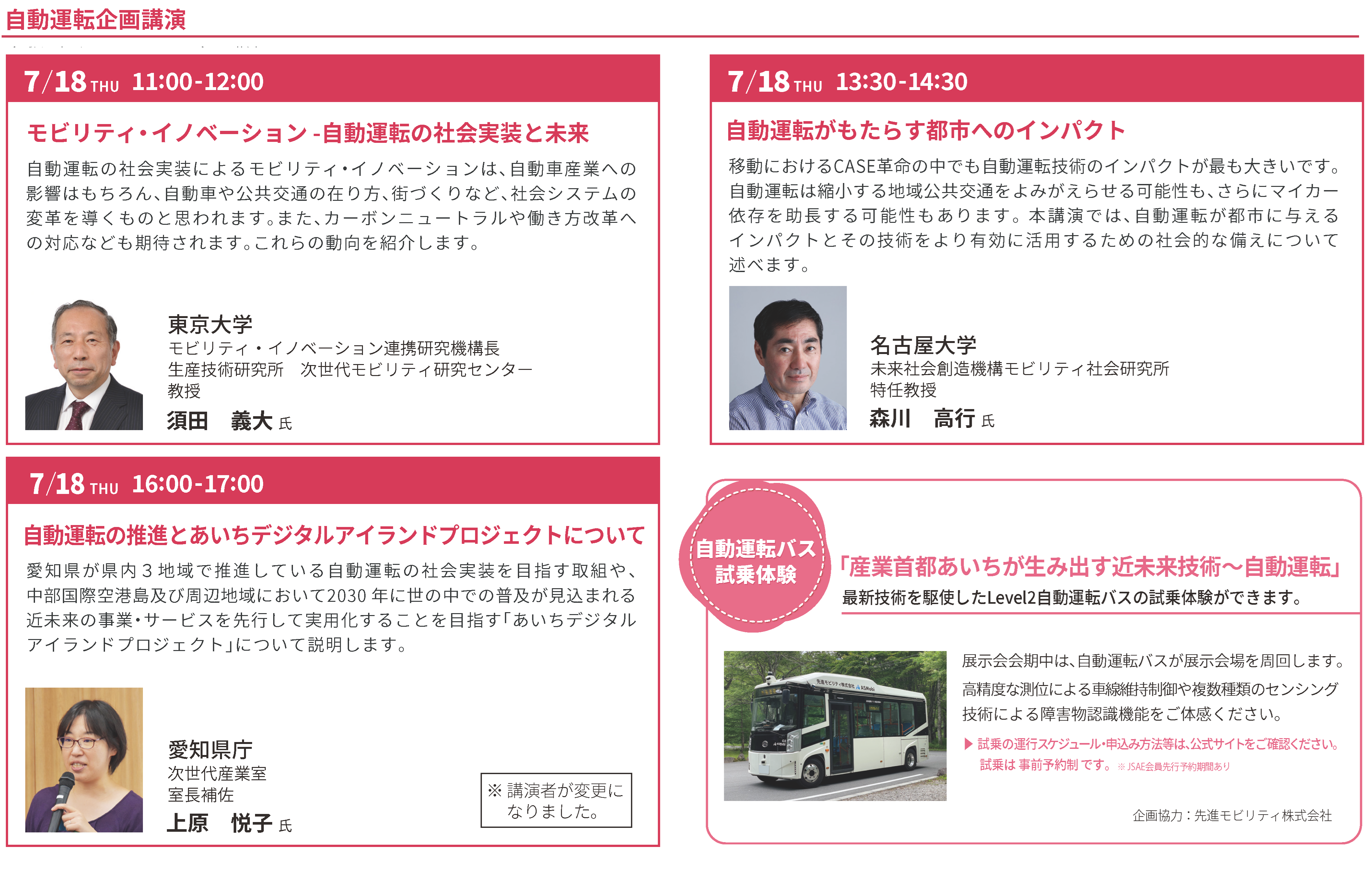 「自動運転」をテーマにした3講演とLevel2自動運転バスの試乗体験を実施します。