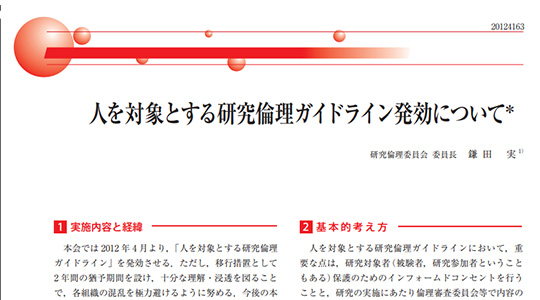 人を対象とする研究を実施する際、研究対象者(被験者)の安全の確保、人権の保護ならびに研究の透明性の確保のため、「人を対象とする研究倫理ガイドライン」を順守してください。