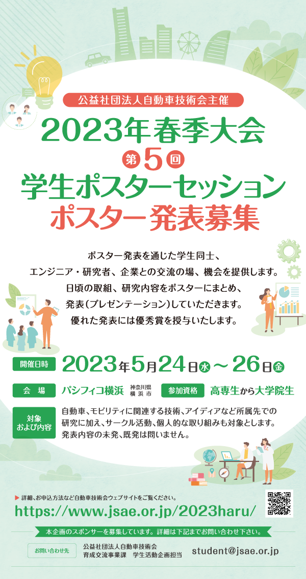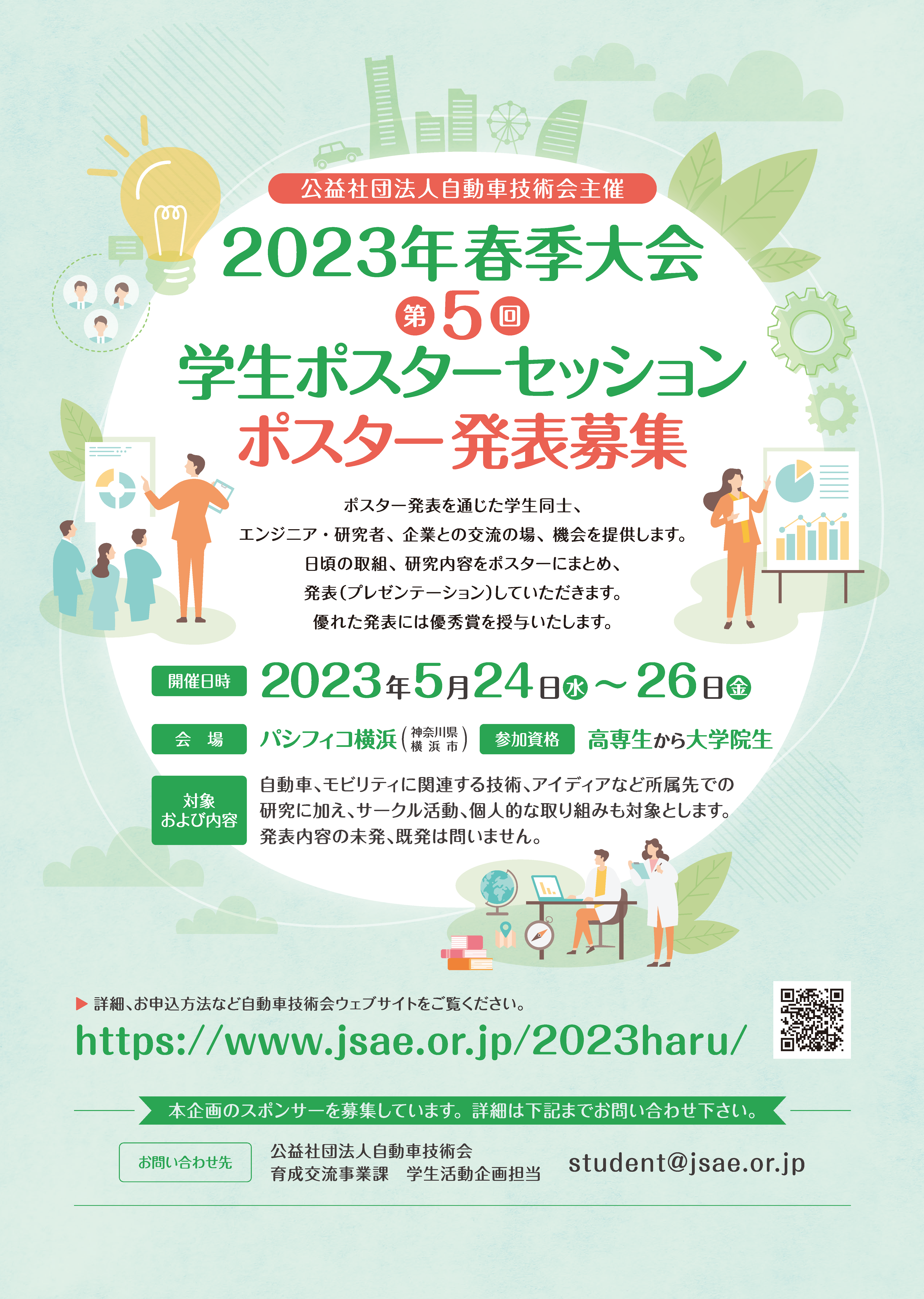 | 発表要件 | ※内容は自動車技術に関連するものである事。未発表のものに限りません ※本企画参加に関して会員資格は問いませんが、参加決定後に2023年春季大会学術講演会の聴講参加登録(有料)が必要です。 非会員の方は若手入会キャンペーン利用で入会金・年会費および当参加登録費が無料となります。 若手入会キャンペーン詳細:https://www.jsae.or.jp/03member/2023cp.php ※各ポスターの著作権は著作者(発表者)に帰属し、本会では何ら権利を留保するものではありません。 |