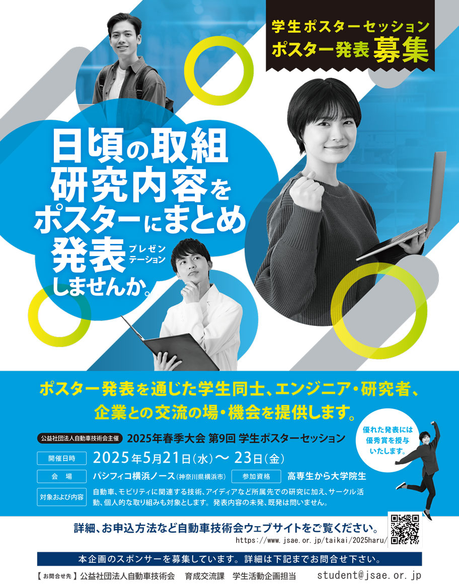 | 発表要件 | ・内容は自動車技術に関連するものである事。未発表のものに限りません。 ・発表にあたり、下記発表申込欄からの申込と別途2025年春季大会学術講演会への参加登録(聴講登録・有料)が必要です。 採否通知後、開催当日までにご登録ください。 学術講演会参加登録:https://www.jsae.or.jp/taikai/2025haru/attend/ ・本企画参加に関して会員資格は問いません。 なお、非会員の方で「入会サポート」キャンペーンをご利用の方は、年会費および学術講演会参加登録料が無料となりますので、ご入会をお勧めいたします。 入会サポート詳細:https://www.jsae.or.jp/mbs/2025cp/ ・ポスター作製は発表者にて行ってください。なお、各ポスターの著作権は著作者(発表者)に帰属し、本会では何ら権利を留保するものではありません。 |