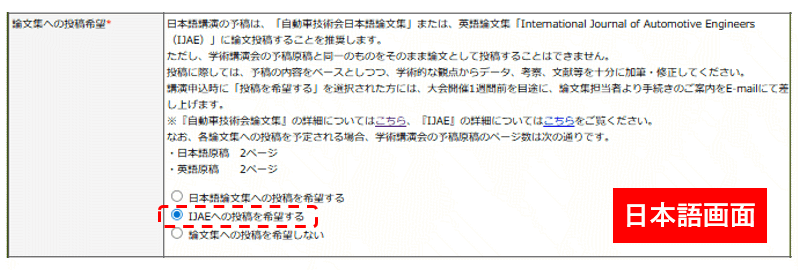 学術講演会に申し込んだ内容を大会終了後にIJAEへ投稿する予定がある場合は、講演申込時に「論文集への投稿希望」にて「IJAEへの投稿を希望する」を選択し、予稿原稿を2ページで作成してください(下画面)。